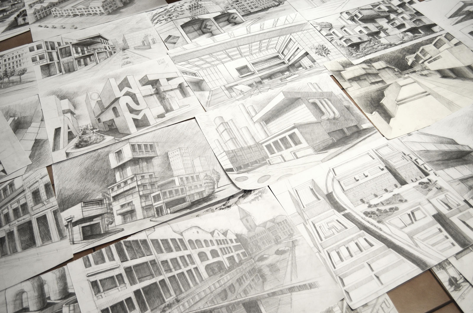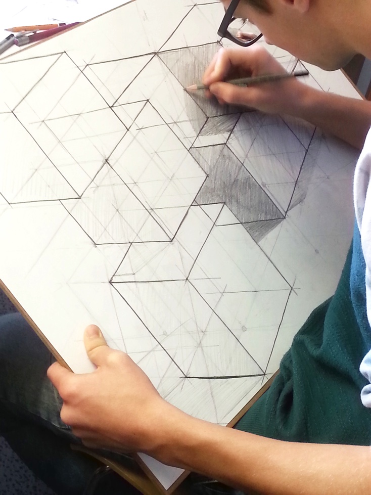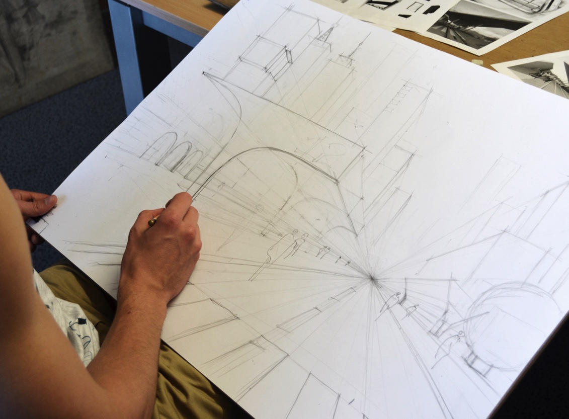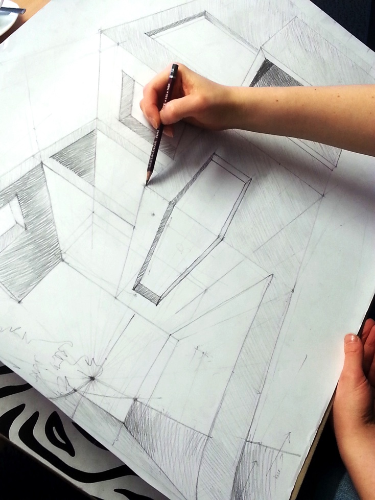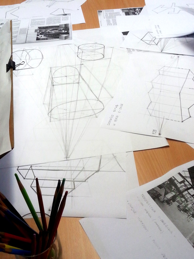 - teoria perspektywy rysunkowej (perspektywa jednozbiegowa, dwuzbiegowa, trójzbiegowa, konstrukcja prostych brył geometrycznych, konstrukcja cieni),